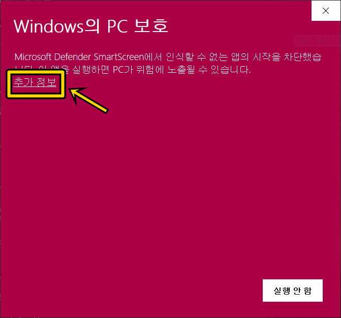 ▲ 미러로이드를 다운받은 후 실행하면 'Windows의 PC 보호' 창이 뜨는데 추가 정보를 클릭하여 이동합니다.