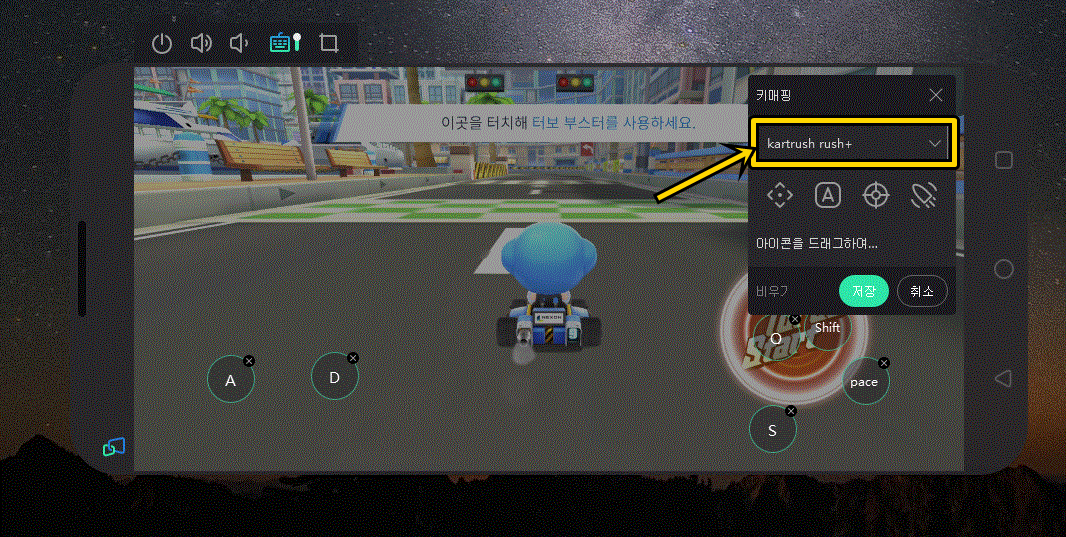 ▲ 키매핑 설정을 카트라이더 러쉬플러스로 바꿔주면 해당 게임에 최적화 된 가상키가 생성됩니다. 마우스 드래그로 가상키를 원하는 자리로 이동시킬 수도 있고, 삭제 및 변경을 할 수도 있습니다.