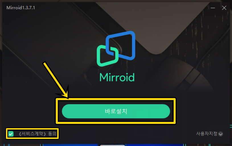 ▲ 좌측 하단에 <서비스계약>동의에 체크 후 바로설치를 클릭하여 계속해서 설치를 진행합니다.