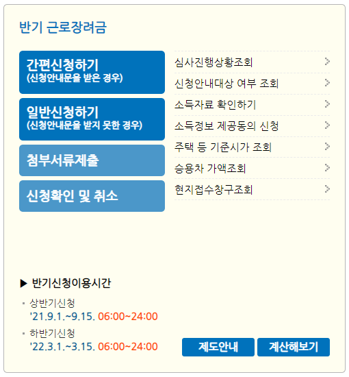 근로장려금 반기 신청을 하기 위해서는 국세청 홈택스 홈페이지를 이용해야 합니다. 해당 홈페이지에서는 근로장려금 상반기 및 하반기 신청 뿐만 아니라, 매월 5월 접수가 가능한 정기 신청과 수령받을 수 있는 금액을 미리 계산해볼 수도 있습니다.