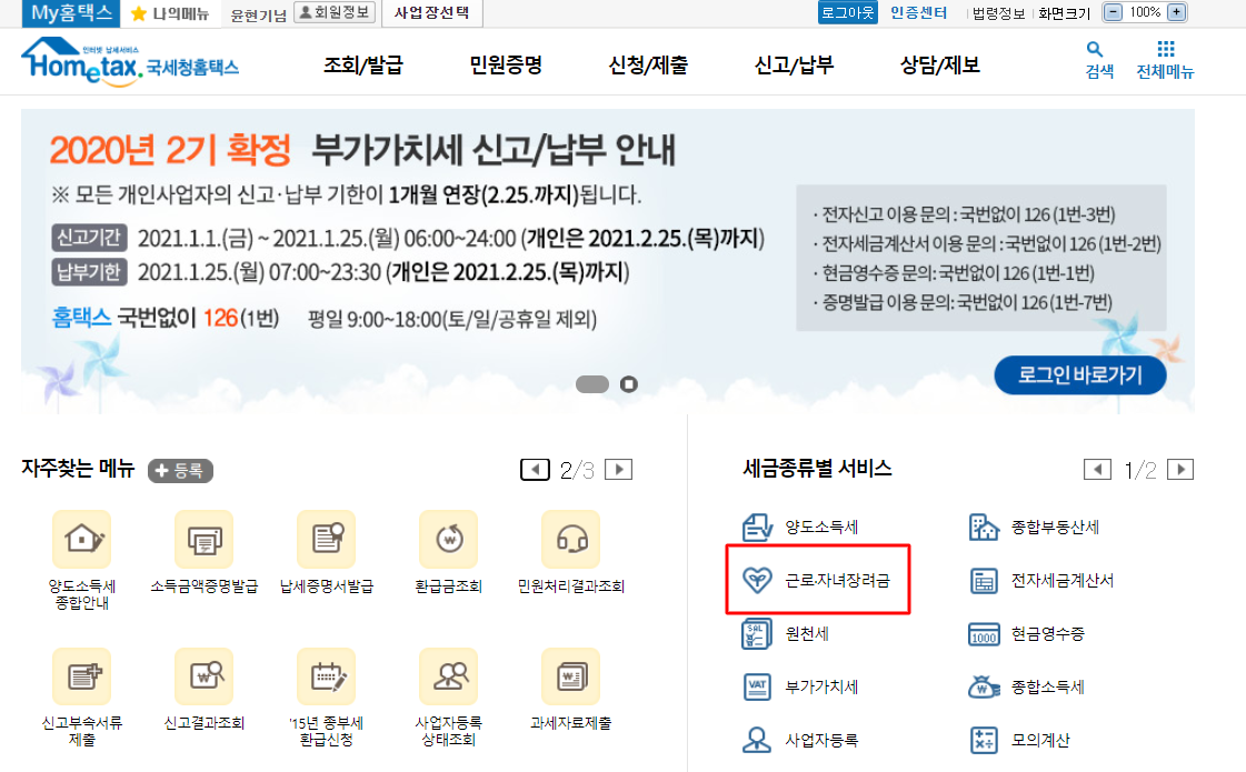 ▲ 국세청 홈택스 홈페이지로 이동하면, 세금종류별 서비스에서 근로장려금을 확인할 수 있습니다. 해당 서비스로 이동해보도록 하겠습니다.